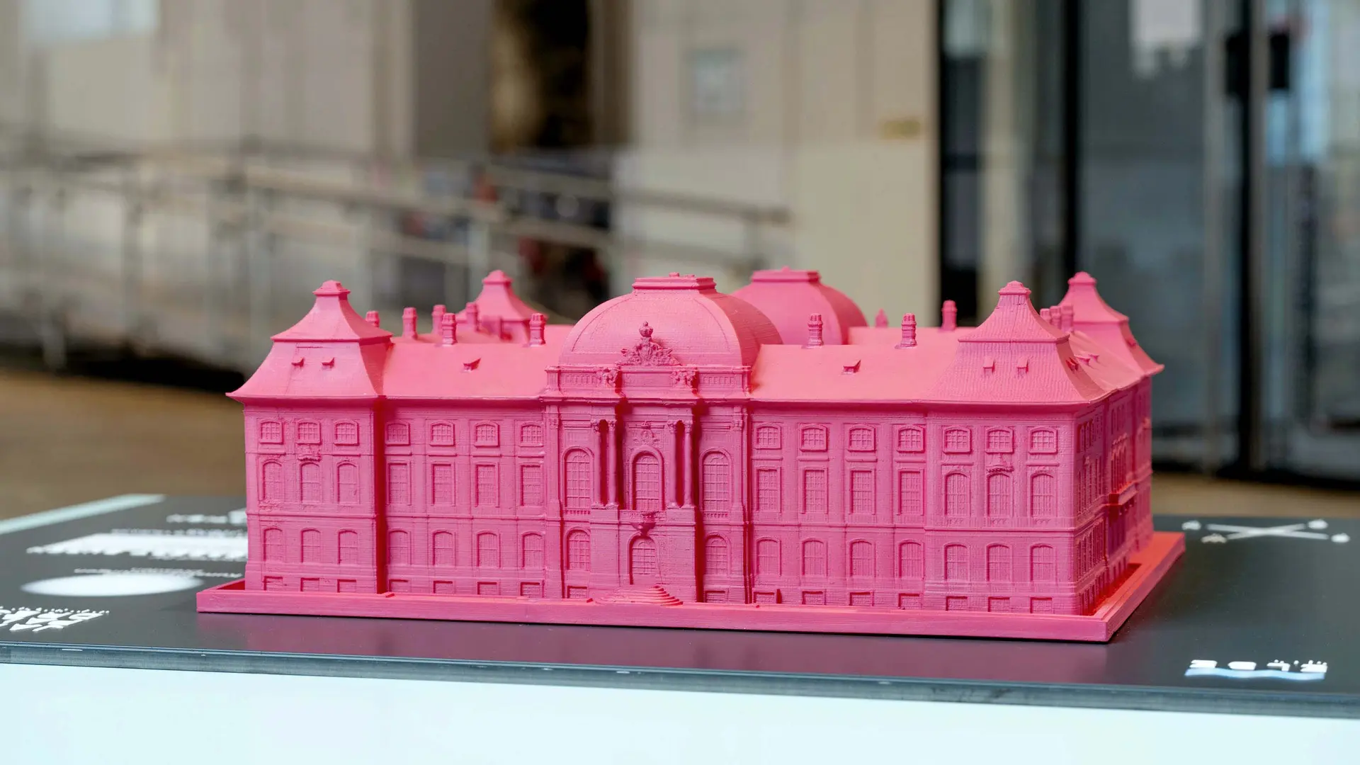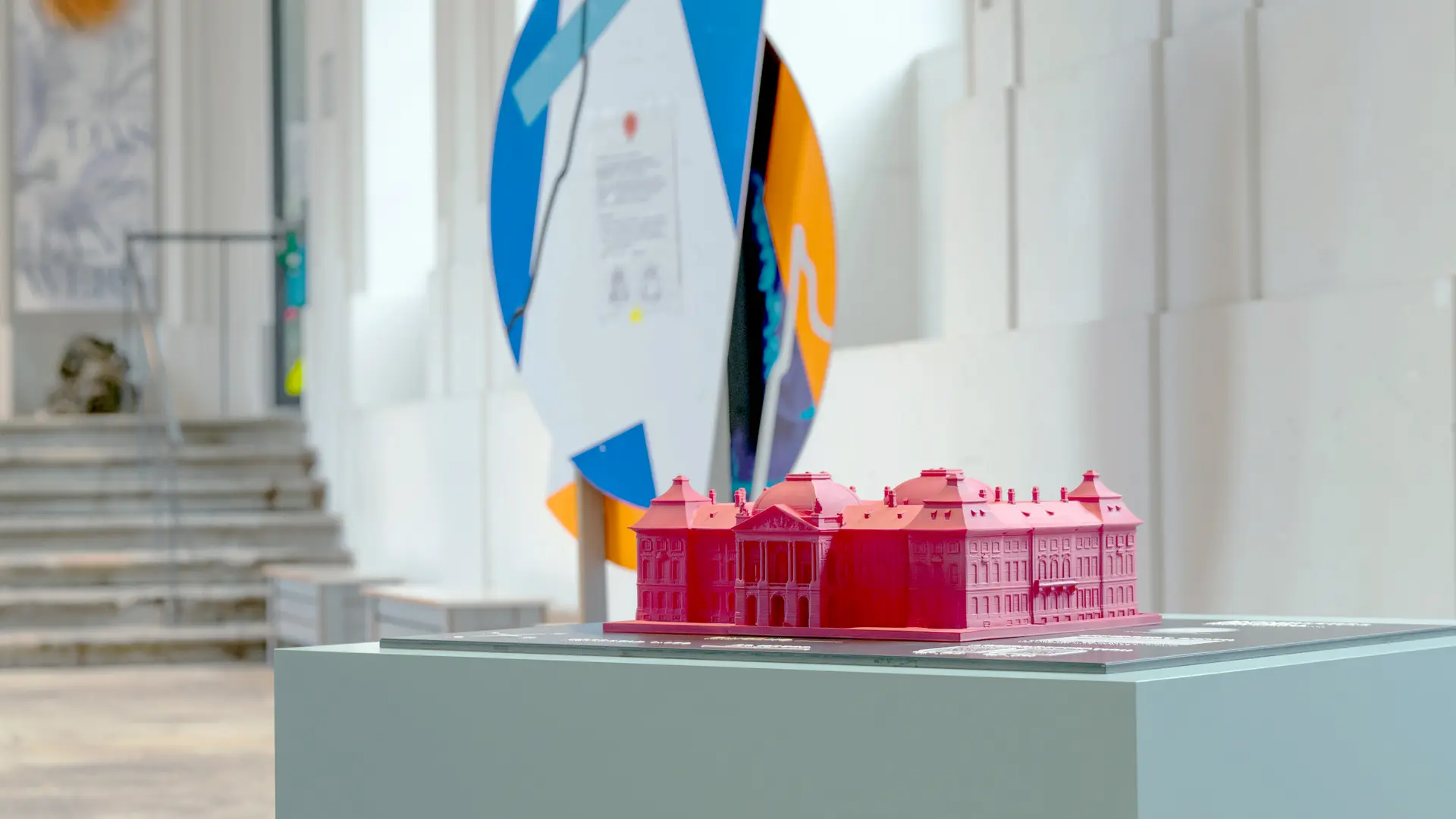 Hier erwartet Sie das imposante Museumsgebäude als pinkes Tastmodell mit Relief- und Braillebeschriftung in Deutsch und Englisch im Maßstab von 1:150. Die verkleinerte Nachbildung des Japanischen Palais ermöglicht es Ihnen, die Architektur und Details dieses historischen Gebäudes vielfältig zu erleben.