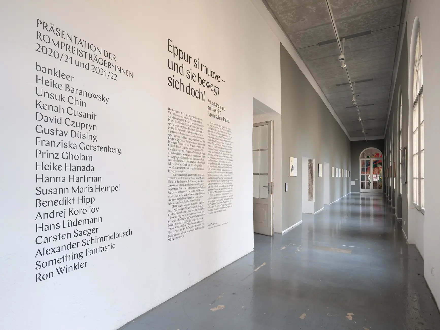 Nachdem die Villa Massimo sich 13 Jahre lang für einen Abend im Gropius Bau Berlin präsentiert hatte, und in 2020 in den KW Institute for Contemporary Art ein dreitägiges Gastspiel gab, verfolgt die Deutsche Akademie Rom seit 2021 die Idee, in den verschiedenen Bundesländern gemeinsam mit lokalen Partnern umfassende Werkschauen des jeweils letzten Rompreisjahrgangs zu zeigen. Das brandenburgische Schloss Neuhardenberg bildete dafür in 2021 den Auftakt. Die Partnerschaft mit den Staatlichen Kunstsammlungen Dresden wird den bisher umfassendsten Auftritt der Villa Massimo in Deutschland darstellen, im Rahmen dessen sich die Jahrgänge 2020/21 und 2021/22 über ein mehr als dreimonatige Laufzeit im Japanischen Palais und mit weiteren Dresdner Partnern (Festspielhaus Hellerau und Jazzclub Tonne) präsentieren.